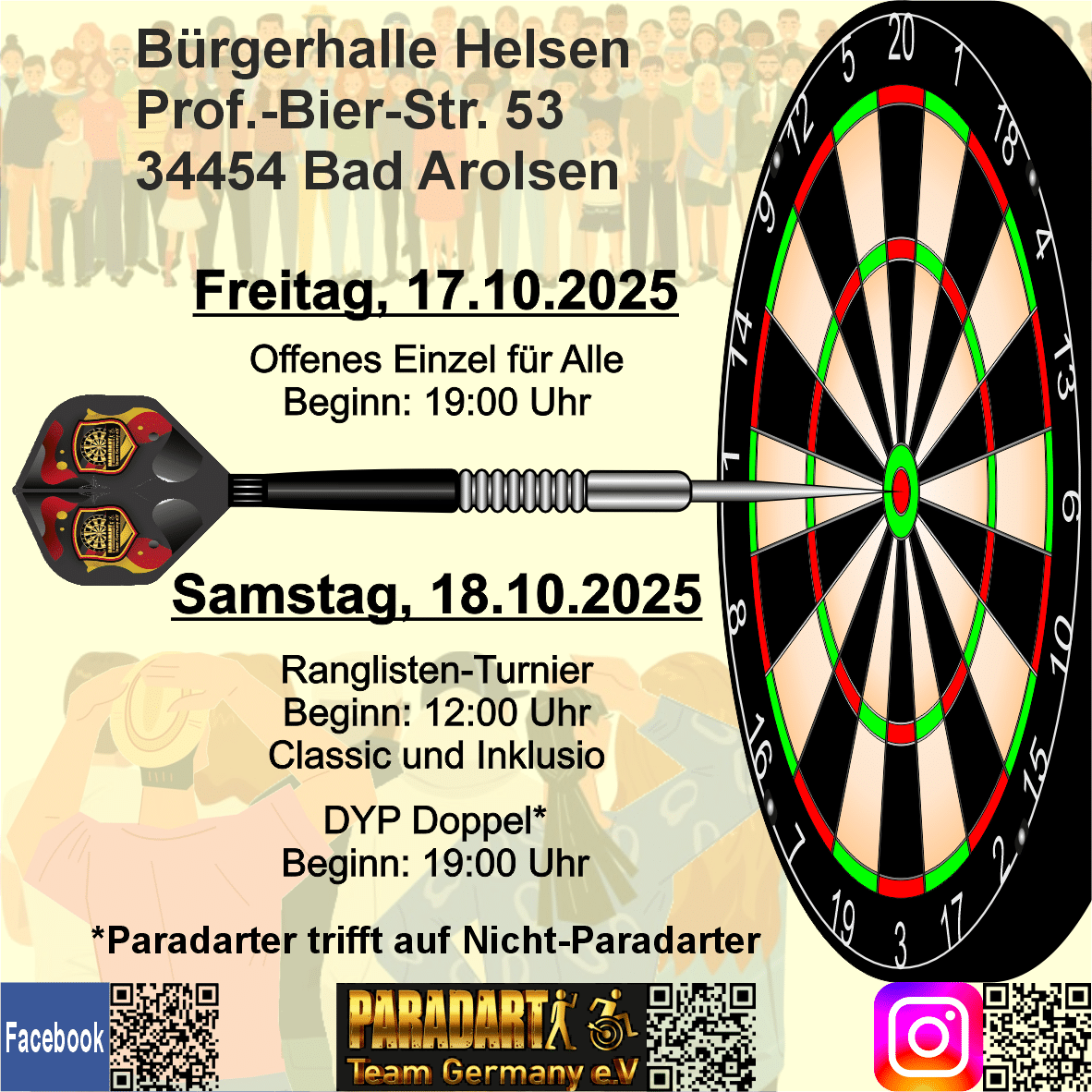Freitag, den 17.10.2025 Offenes Einzel für Alle Beginn: 19:00 Uhr Samstag, den 18.10.2025 Ranglistenturnier Classic + Inklusio Beginn: 12:00 Uhr DYP-Doppel* Beginn: 19:00 Uhr *Ein Paradarter und ein Nicht-Paradarter bilden gemeinsam ein Team Über diesen 2K Link gelangt man zur Anmelden: https://2k-dart-software.com/frontend/events/2/mandant/1289 Das nächste Turnier findet im November online statt. Weitere Infos folgen. [...]